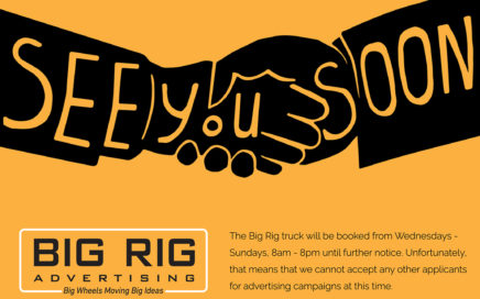 The Big Rig truck will be booked from Wednesdays – Sundays, 8am – 8pm until further notice. Unfortunately, that means we cannot accept any other applicants for advertising campaigns at this time.