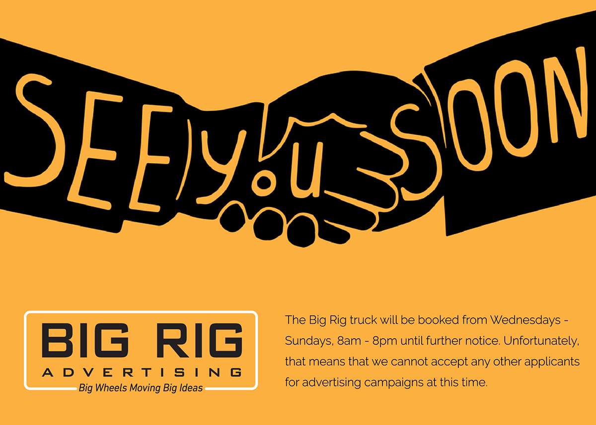 The Big Rig truck will be booked from Wednesdays – Sundays, 8am – 8pm until further notice. Unfortunately, that means we cannot accept any other applicants for advertising campaigns at this time.